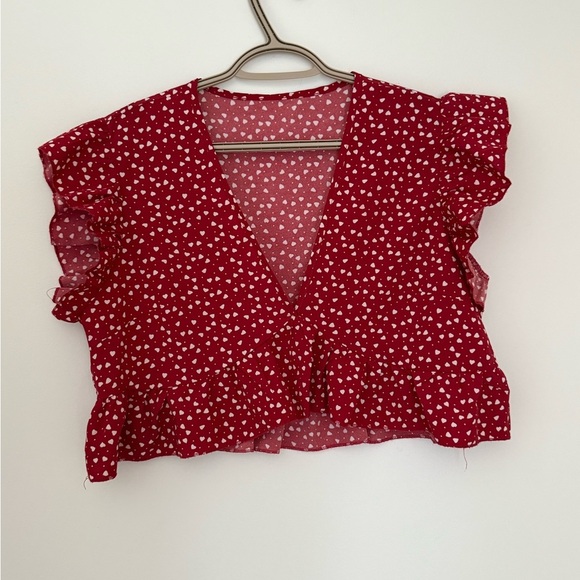Charming burgundy blouse with heart design. Features V-neck and ruffled sleeves. Perfect for casual wear.
