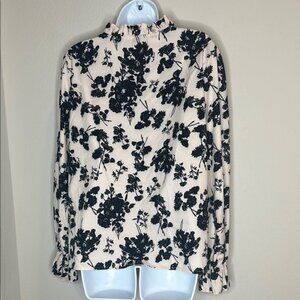 Elegant floral blouse with tie neckline. Long sleeves with gathered cuffs.