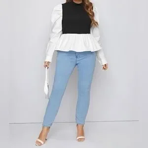 Like-new condition! Can be dressed up or dressed down for a more comfortable and relaxed fit. Puffy sleeves and peplum style offers a classy look for a workplace outfit should you choose. The fit is big in the arms (at least for me), but overall the material is non-stretch