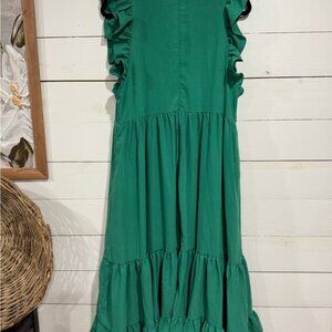 Chic green midi dress with ruffle sleeves. V-neck design for a stylish look. Ideal for versatile wear.