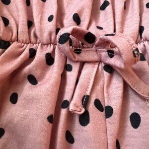 This little girls romper short one piece outfit is adorable. It is a cute shade of pink with black polka dots. It is pre-owned but I see no flaws. The bow in the front at the waist is for decor only. I believe we tied the straps as our girl is petite.