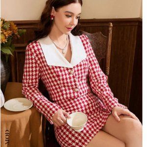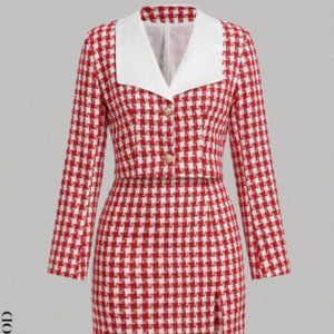 SHEIN MOD HOUNDSTOOTH PRINT CONTRAST COLLAR JACKET & SPLIT HEM SKIRT Suit