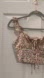 Chic crop top with vibrant floral design. Features playful ruffles and tie front. Ideal for casual outings. Size XS
