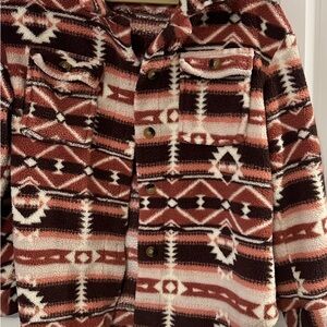 Cozy jacket with a blend of pink, brown, and cream patterns. Perfect for layering.