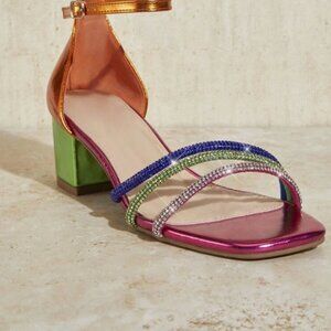 Vibrant heels with colorful straps. Perfect for a bold look. Comfortable block heel design.