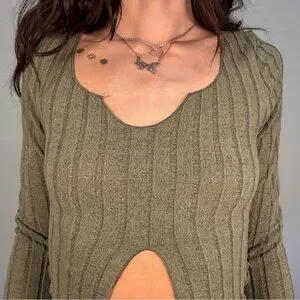 Stylish olive ribbed crop top. Features unique neckline and cut-out design. Perfect for casual wear.