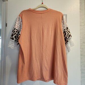 Shein Peach blouse with ribbed texture. Features leopard print and lace on sleeves. Stylish and unique design. Size extra large excellent pre-owned condition. Smoke free home.