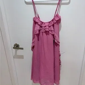 Chic pink dress with ruffle details. Spaghetti straps. Flowy and elegant.