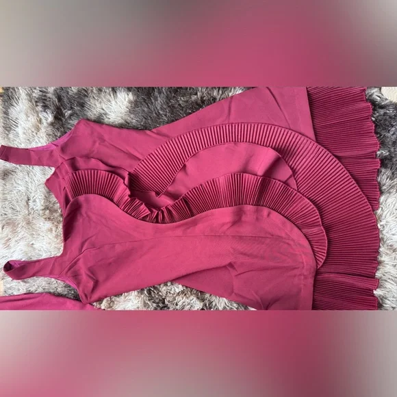 Elegant pink dress with ruffled details. Sleeveless design. Perfect for any occasion.
