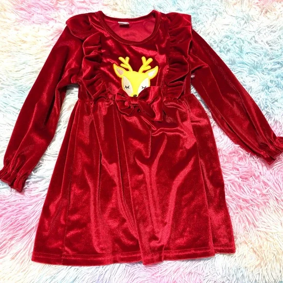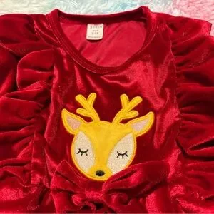 Charming red velvet dress with reindeer applique. Perfect for casual wear. Soft and stylish for kids.