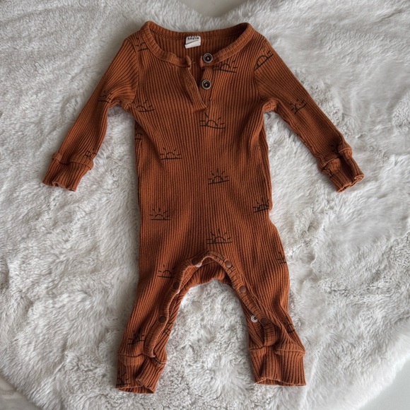 Ribbed long-sleeve one-piece in warm rust. Printed sunrise details across the fabric. Henley-style neckline with two buttons. Snap closures at the legs for quick changes. Stretchy knit for comfortable wear.