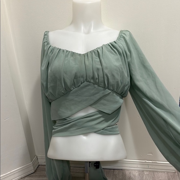 Chic sage green blouse with a wrap detail. Long puffed sleeves and gathered neckline. Perfect for stylish outings.