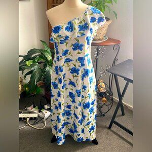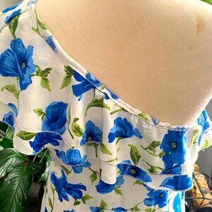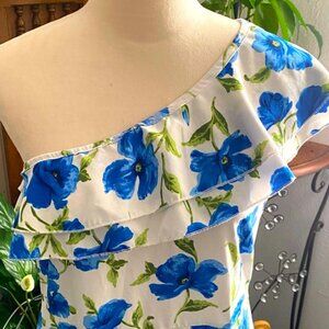 Elegant one-shoulder dress with vibrant blue floral pattern. Ideal for summer events. This dress is previously owned, however still in good condition. Always willing to accept a reasonable offer. Happy shopping!