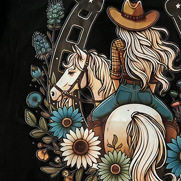 Front of tee has image in top left chest and back of tee is wild flowers, wild horses text.