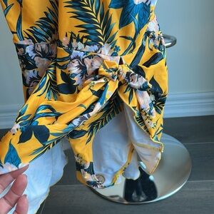 One piece floral swimsuit with skirt that can be tied to the side as shown in pictures.