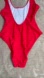 Item keywords: shekini; swimwear; one-piece; swimsuits; summer; vacation; red; high cut; low back; scoop neck; bold; fun