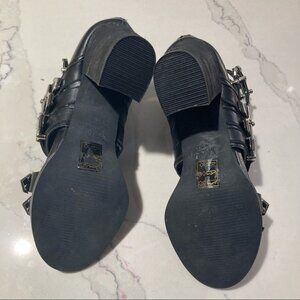 SHELLYS LONDON Sz 5 Stacked 2.5” Heel Buckle Accents Sandals. Rocker, classy punk, edgy and trendy shoes that are a statement. Like new.