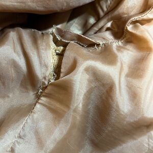 Color: Khaki Style: casual Pattern type: plain Type: teddy Details: two front pocket & button front Neckline: lapel Sleeve length: long sleeve Sleeve type: regular sleeve Length: to your hips Fit type: regular Fabric: non stretch Super warm & comfortable. Hole in lining under right arm and small burn hole on left arm near cuff .. barely visible. In well love condition.
