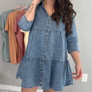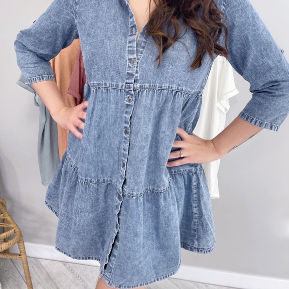 Description: 3/4 SLEEVE BUTTON DOWN SHIRT DRESS WITH TWO LAYERED