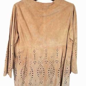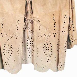 SHIRT, SUEDE CUT-WORK, MISSES X-SMALL, WHEAT COLOUR, DANIER LEATHER, BELL SLEEVES, SCALLOPED EDGES & HEM, COLLARLESS, SUEDE TIE CLOSURES, NO POCKETS, UNLINED, VERY SOFT SUEDE, TAGS ON