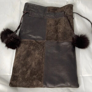 SHOE BAG Dark Chocolate Brown Pom Pom Drawstring Genuine Leather Fur Patchwork