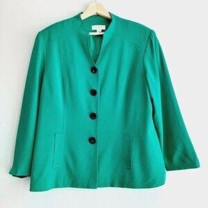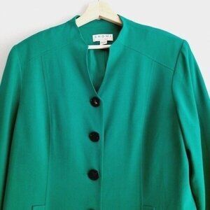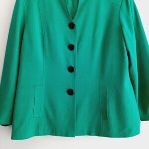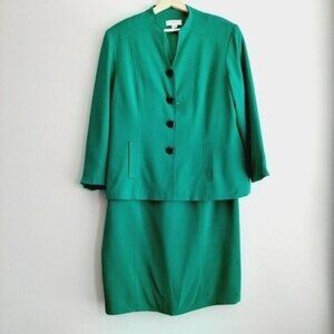 • Fully lined two piece set in beautiful, bright green color. Blazer jacket has front button closure, padded shoulders and faux pockets. Skirt features back slit and button/zip closure with lightly elasticized back portion of the waist.