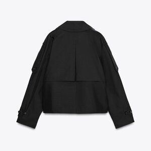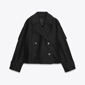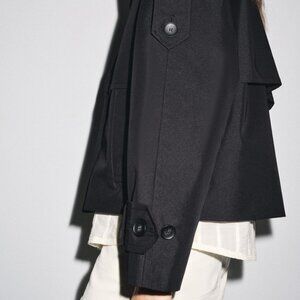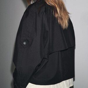 Short trench coat made from a cotton-blend yarn. Notched lapel collar with adjustable tab and buttons. Long sleeves. Front pockets. Tab detail on shoulders. Double-breasted button closure. Color is Black. Size M.