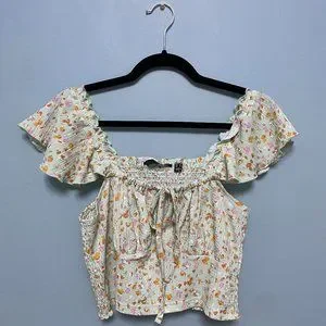 Green top with floral design cropped t-shirt that can be worn off the shoulder.