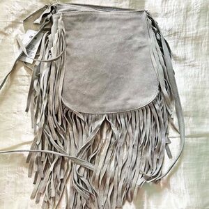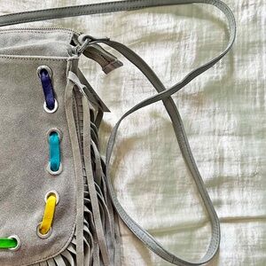 SHOULDER BAG, ASOS SUEDE LEATHER, LT GREY, COLOURED SUEDE LACE ACCENTS, LONG SHOULDER STRAP, TAG ON, NEW NEVER USED, NO DAMAGE