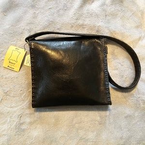 SHOULDER BAG, LEATHER, 9x9x1.5 inches, BLACK/BEIGE, SHINY GOLD TONE METAL CLASP, HANDMADE IN CANADA, TAG ON, NEVER USED