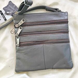 SHOULDER BAG, LEATHER, SQUARE, MEDIUM GREY, ZIP CLOSURES, MADE IN INDIA, TAG ON, NEW NEVER USED, NO DAMAGE