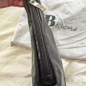 SHOULDER BAG, RENATO ANGI VENEZIA, MADE IN ITALY, SOFT CALF LEATHER, BLACK, TOP ZIP, CONTEMPORARY CURVES AND ACCENTS, HAS POCKETS, SLEEPER BAG, LINED, FROM BROWNS HOLT RENFREW, TAGS ON, NEW, NEVER USED, NO DAMAGE