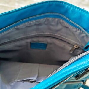 SHOULDER BAG, TEAL, BY KGB, PVC FAUX LEATHER, ZIPPERED POCKETS, TOP ZIPPER CLOSURE, ADJUSTABLE STRAP, TAG ON, NEW NEVER USED, NO DAMAGE