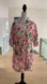 Show Me Your MuMu Brie Garden of Blooms rose floral pattern tie waist short robe. White with pink and green pattern. Short sleeves. Lightweight. Front is shorter than back. Back has a curved hem, front is straight across. 100% polyester.
