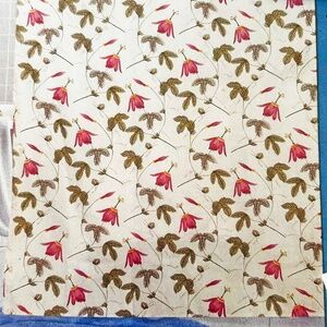 COLOURS: Cream background with flowers in reds and leaves in greens.