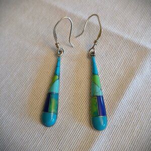 Style tags: vintage, rare, jewelry, silver, mexican, mexico, southwestern, turquoise, lapis, stone, inlay, dangle, drop, earrings, ear rings, boho , festival, feminine, green, blue, wanted, low price, discount, reduced, instagram, tiktok, college, university, gift, sister, girlfriend, mother, wife, signed, brand, 1990s, Y2K, 1980s, fashion, cottagecore, casual, chic, formal, graduation