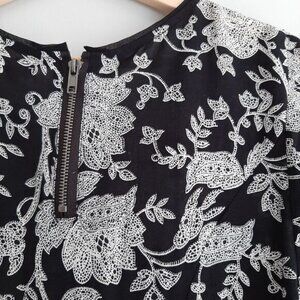 • Scoop neck light dress in black with all-over white lace style flower print, raw hem and exposed metal back zip closure.
