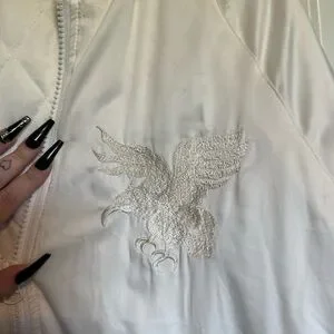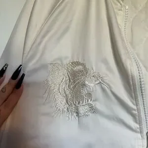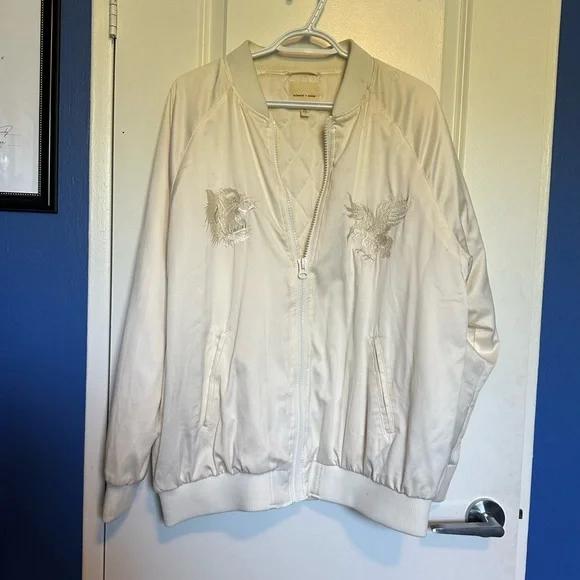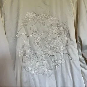 stunning embroidered details on the chest and back. jacket is off white in colour and light enough for spring/fall. in great condition