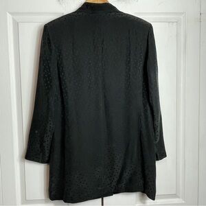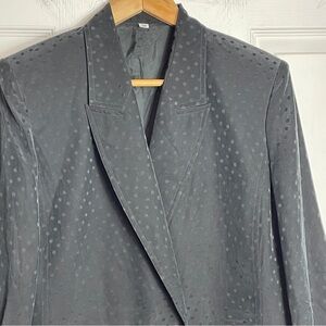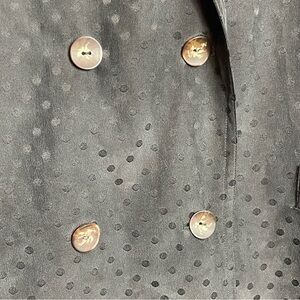 Spotted silk jacket is fully lined & double breasted. Features front welt pockets (which are still stitched shut) and shoulder padding. The silk has a pebble washed/fade wash to it and is tonal printed with spots. Marked size 38 (closest to a size 10). Please compare mamts provided, for desired fit. There are not any other identifying tags, however, am confident it’s made of silk (excluding lining). It’s in gorgeous shape and begging to be seen.