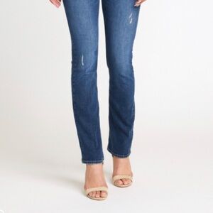 SILVER JEANS Tuesday Bootcut Faded Whisker Low rise with the perfect front-to-back proportions and contoured waistband gives the illusion of curves and never gaps. A silhouette that perfectly smooths, lifts and hugs your thighs and backside. Finished with an authentically distressed dark wash, contrast stitching and signature s-scrolls. Slim bootcut jeans with a distressed dark indigo wash 7.75" low rise Power stretch denim with recovery 5-pocket styling with a zip fly. Sz 31 x 35”