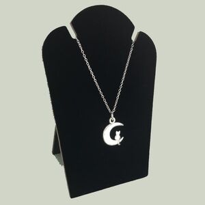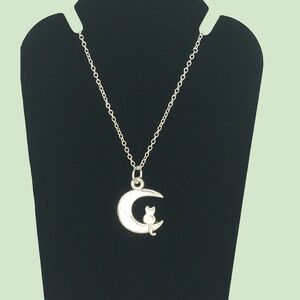 SILVER Plate Chain Kitty on Quarter Moon Necklace Hand-Crafted