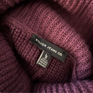 Embrace the cozy elegance of this Silver Jeans sweater, featuring a rich purple hue and a stylish cowl turtleneck. Its sleeveless design and relaxed fit make it perfect for layering, while the ribbed knit texture adds a touch of sophistication to your fall and winter wardrobe.
