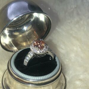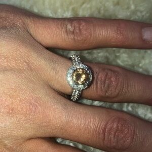 Simulated center stone is similair to morganite but more of an orange peachy colour!