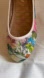 Women’s ballet flats featuring a multicoloured vibrant floral design with a tan lining, man-made materials. Simmy Shoes are apparently a brand made in India. With the different pattern on each shoe, these are eye-catching and novel.