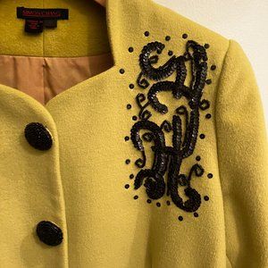SIMON CHANG blazer, size 12, colour lemon with a hint of lime with black bead work, like new, polyester blend, again this was my mothers , i kept it for me but never got there. even the buttons are beaded. feels like a felt