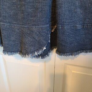 Beautifully flattering fit and flare jean skirt with some stretch. Content and size tag has been removed but the waist is 15" (laid flat). Raw hem.