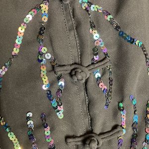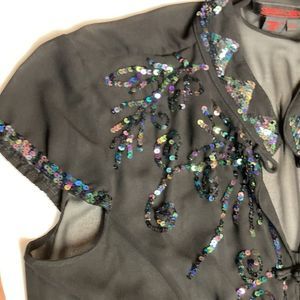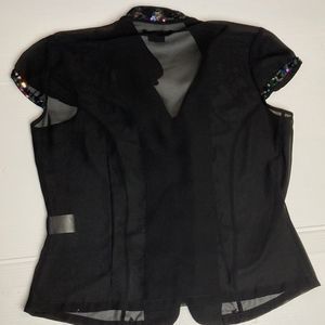 EUC- sheer blouse. Mandarin collar, cap sleeves, frog closure. Sequin detail