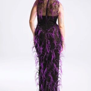 Simone is the ultimate statement. With a black corset and mesh netting material, purple ostrich feathers and crystals are strategically placed, creating the perfect amount of volume around the neckline and lower skirt of the garment.