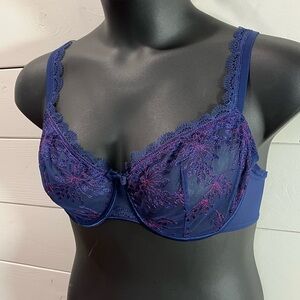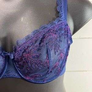 Elegant navy blue bra adorned with intricate purple embroidery and sheer lace details. Features underwire support and adjustable straps for a perfect fit.