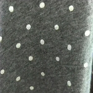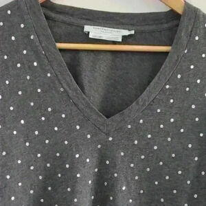 • Style: Pull over, 3/4 length sleeves, dark grey textured v-neck with silver polka dots, very stretchy, fits more like a medium